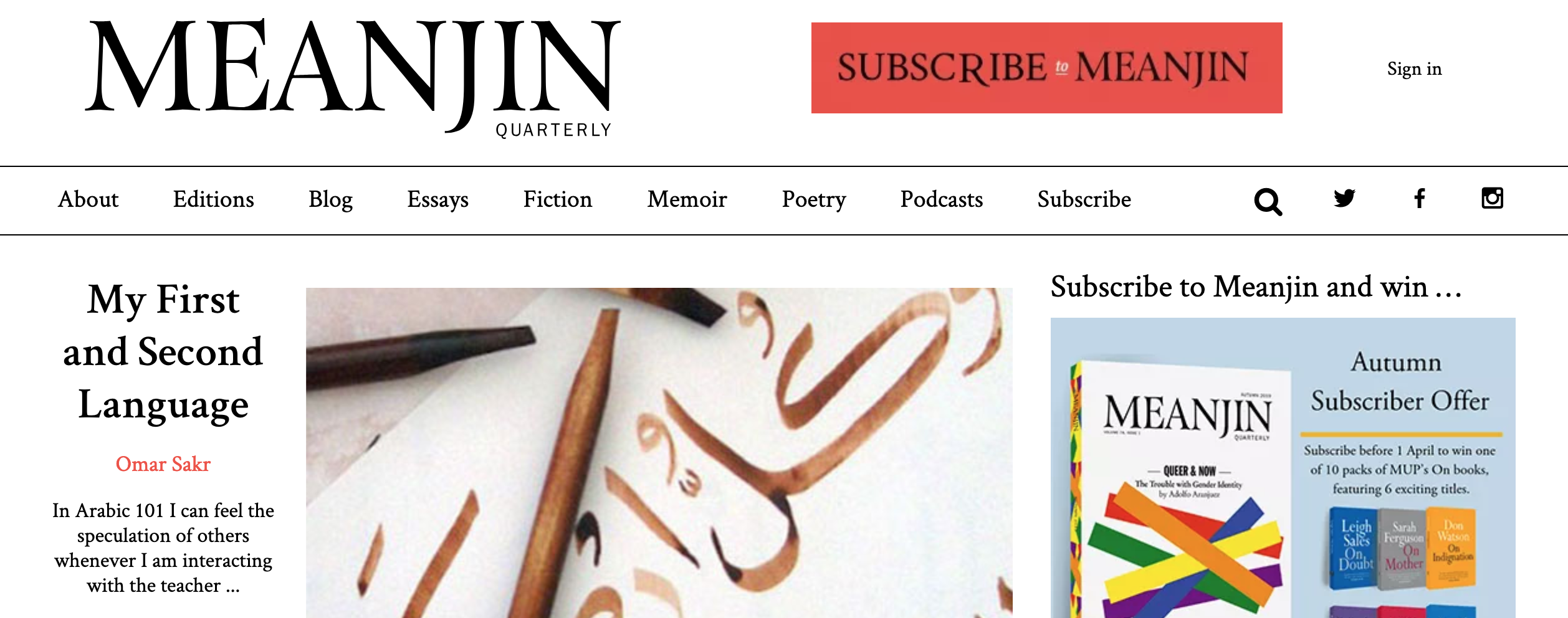 Meanjin is known primarily as a literary magazine which showcases contemporary thinking, be it on literature, other art forms, or the broader issues of the times. Search for memory, memorial, history or remembering.